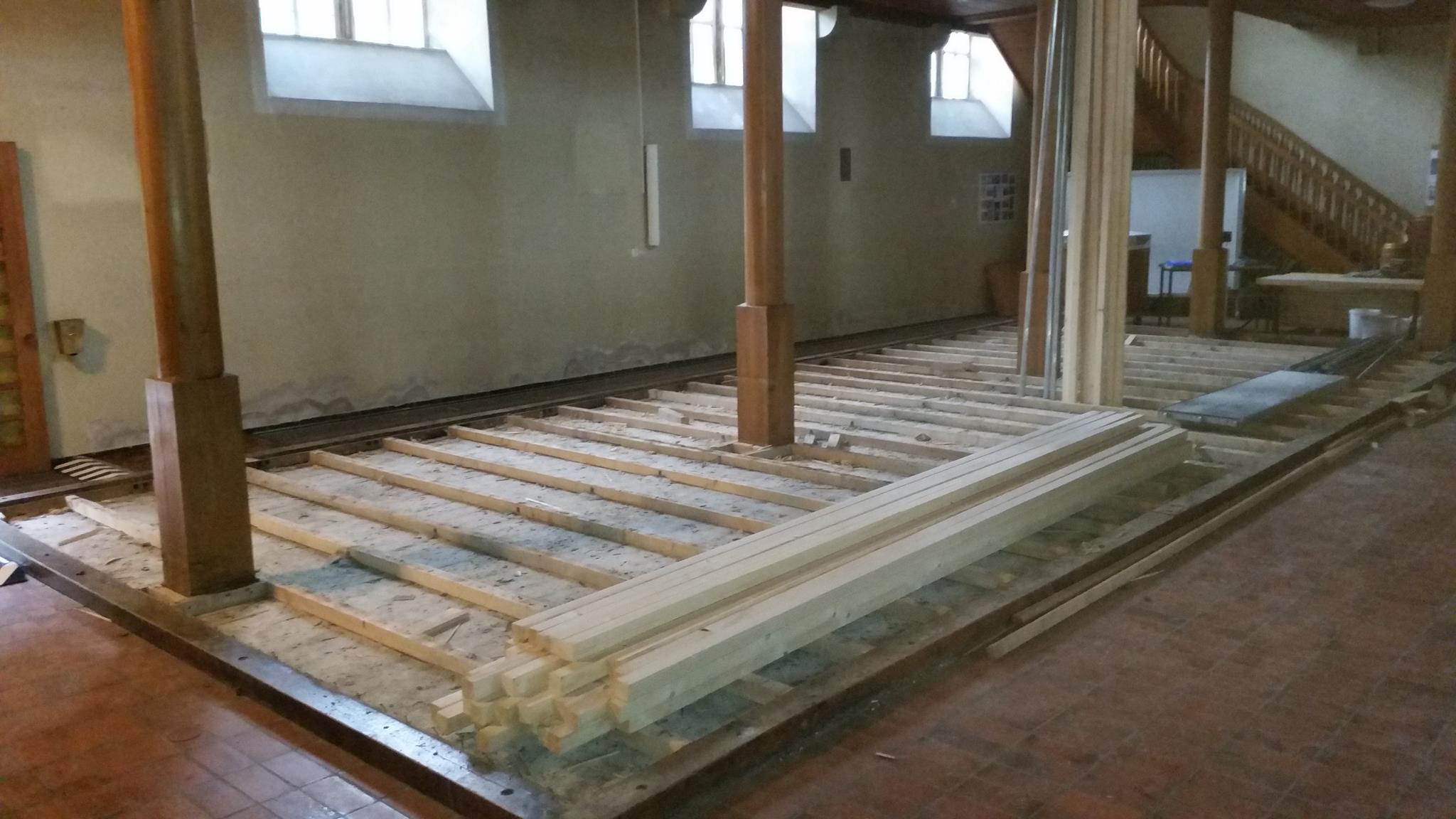 Wo früher einmal die Treppe zur zweiten Empore war, ist nun ein Loch. Wegen des Ausbaus der zweiten Empore wird die Treppe nicht mehr benötigt.