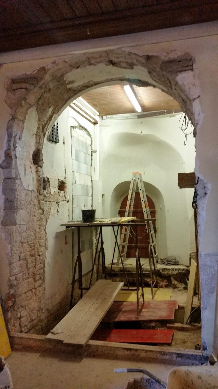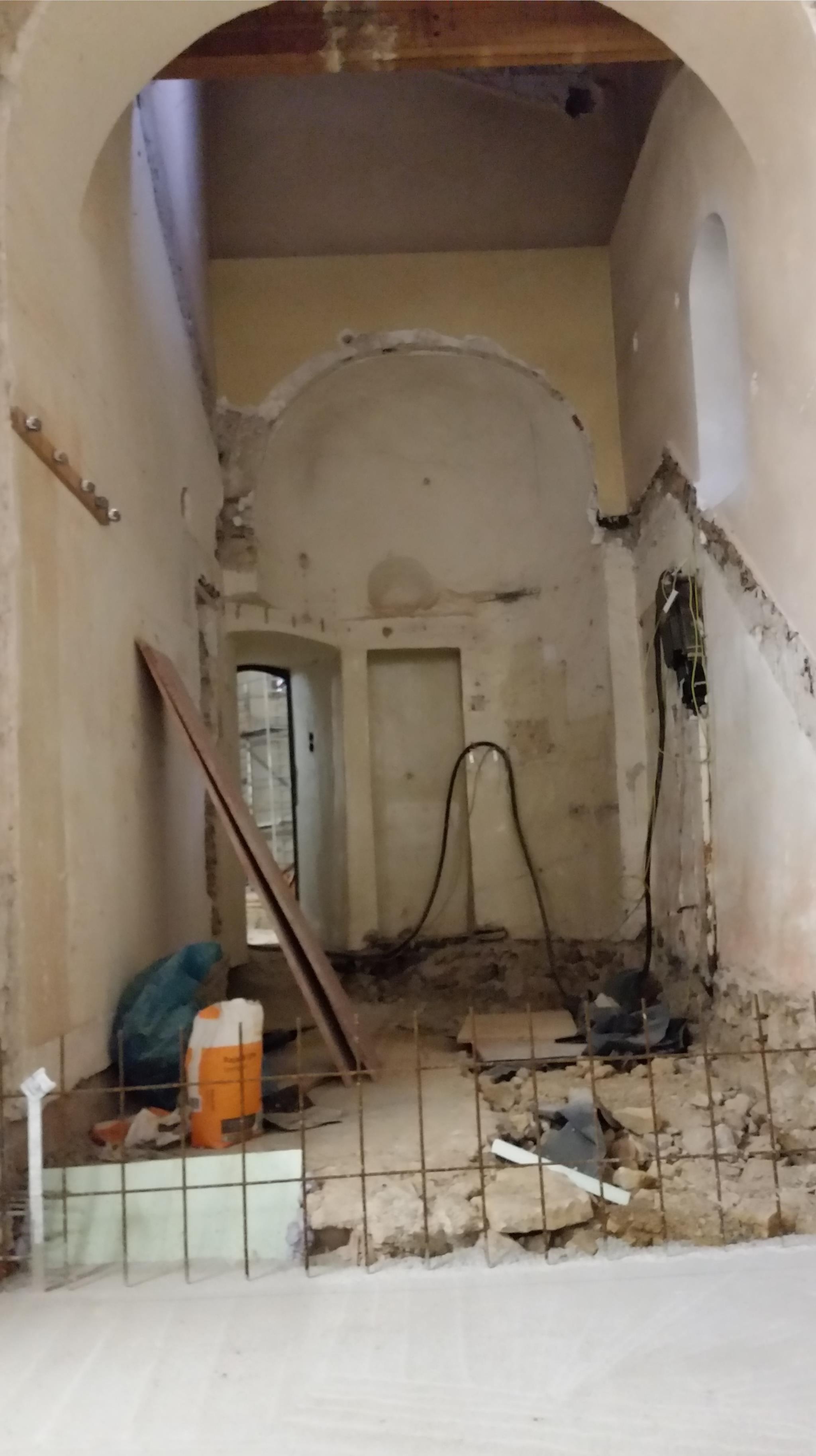 Blick in die eröffnete Apsis auf der Freithofseite. Der Aufgang zur Kanzel ist entfernt, im Hintergrund die Tür zur Sakristei. Die unter der Vierung liegende Krypta ist künftig direkt vom Kirchenschiff aus zugänglich.