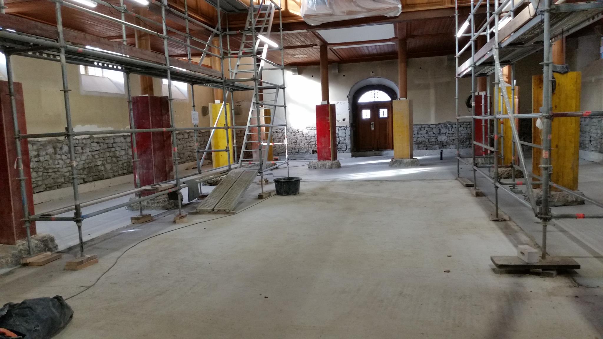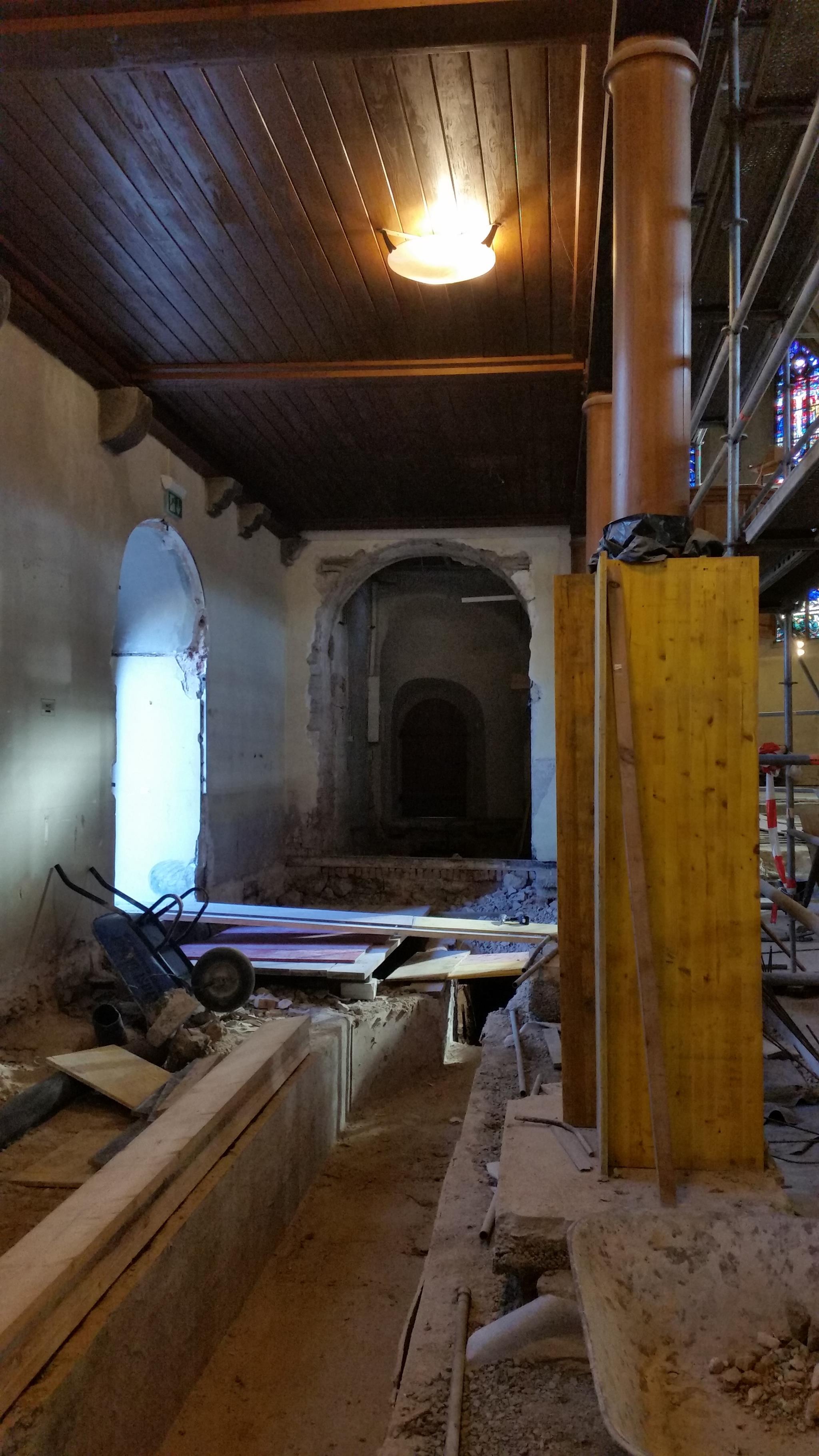 Im Kirchenschiff hat sich einiges getan, der neue Estrich ist eingebracht. Der Putz an den Innenwänden ist teilweise abgeschlagen und gibt einen Blick auf das Mauerwerk frei. Die Treppe zur oberen Empore ist entfernt.