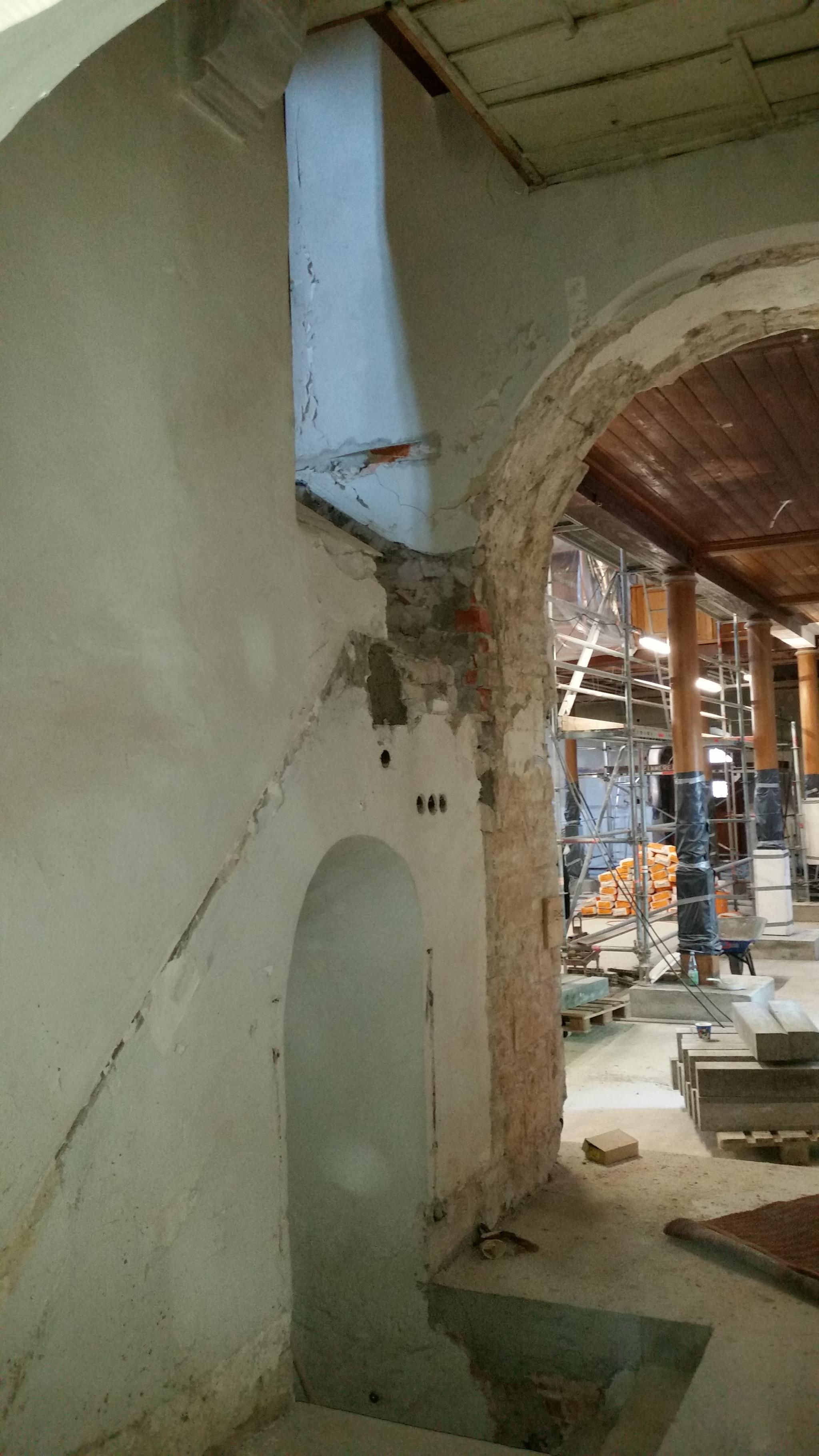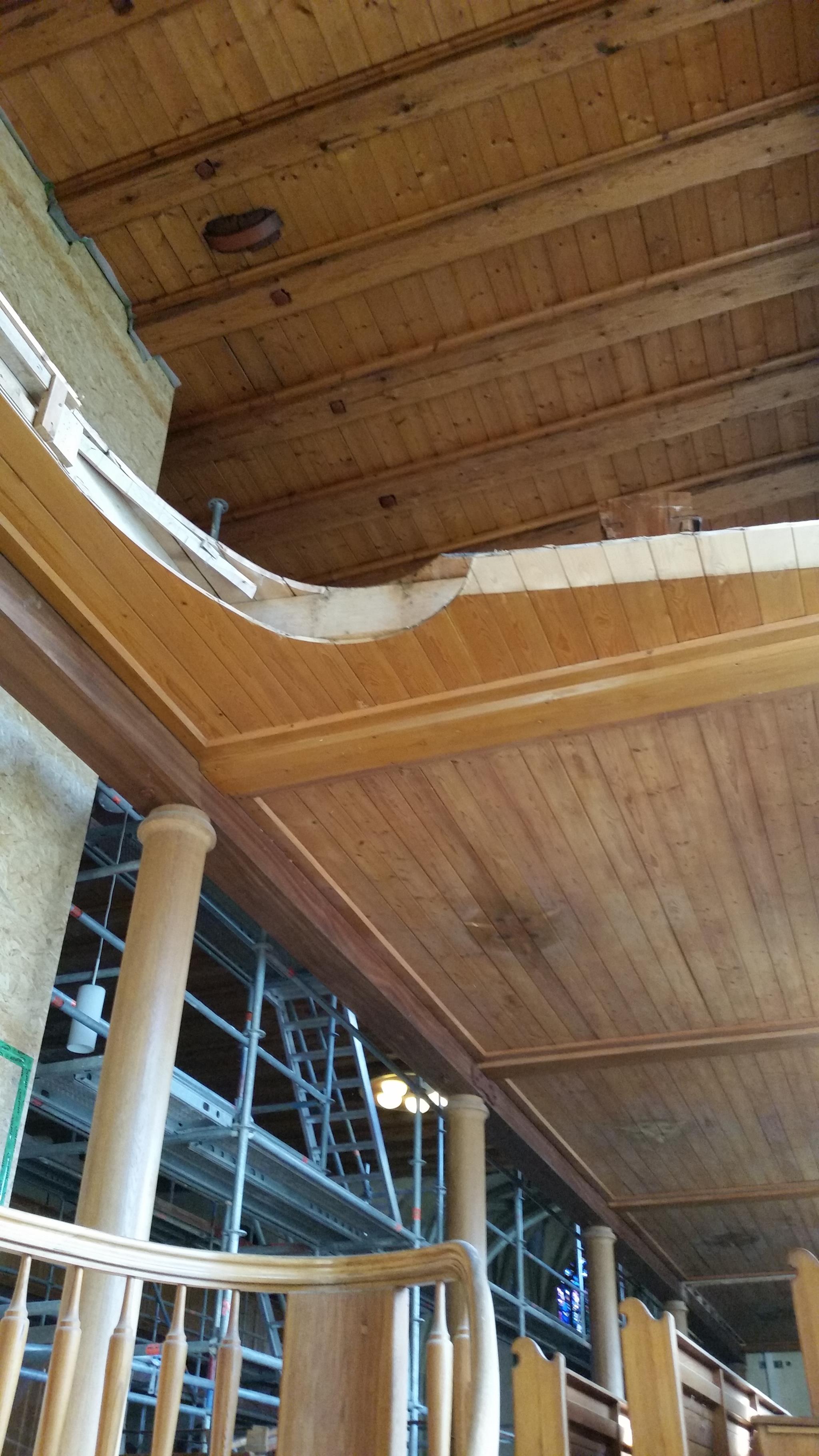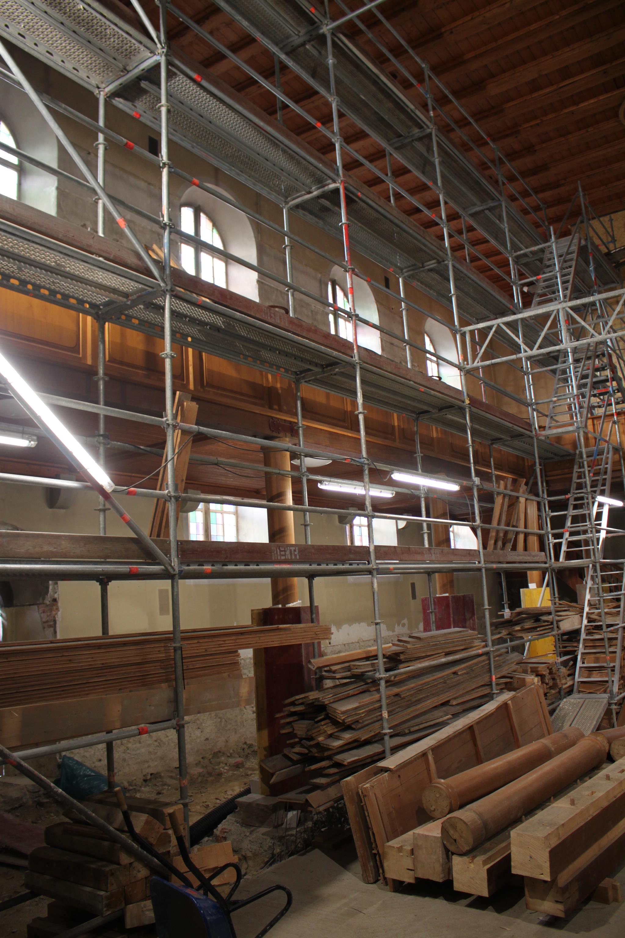 Die obere Empore ist entfernt. Die sichtbaren Teile werden entsprechend der Auflage des Denkmalamts eingelagert.