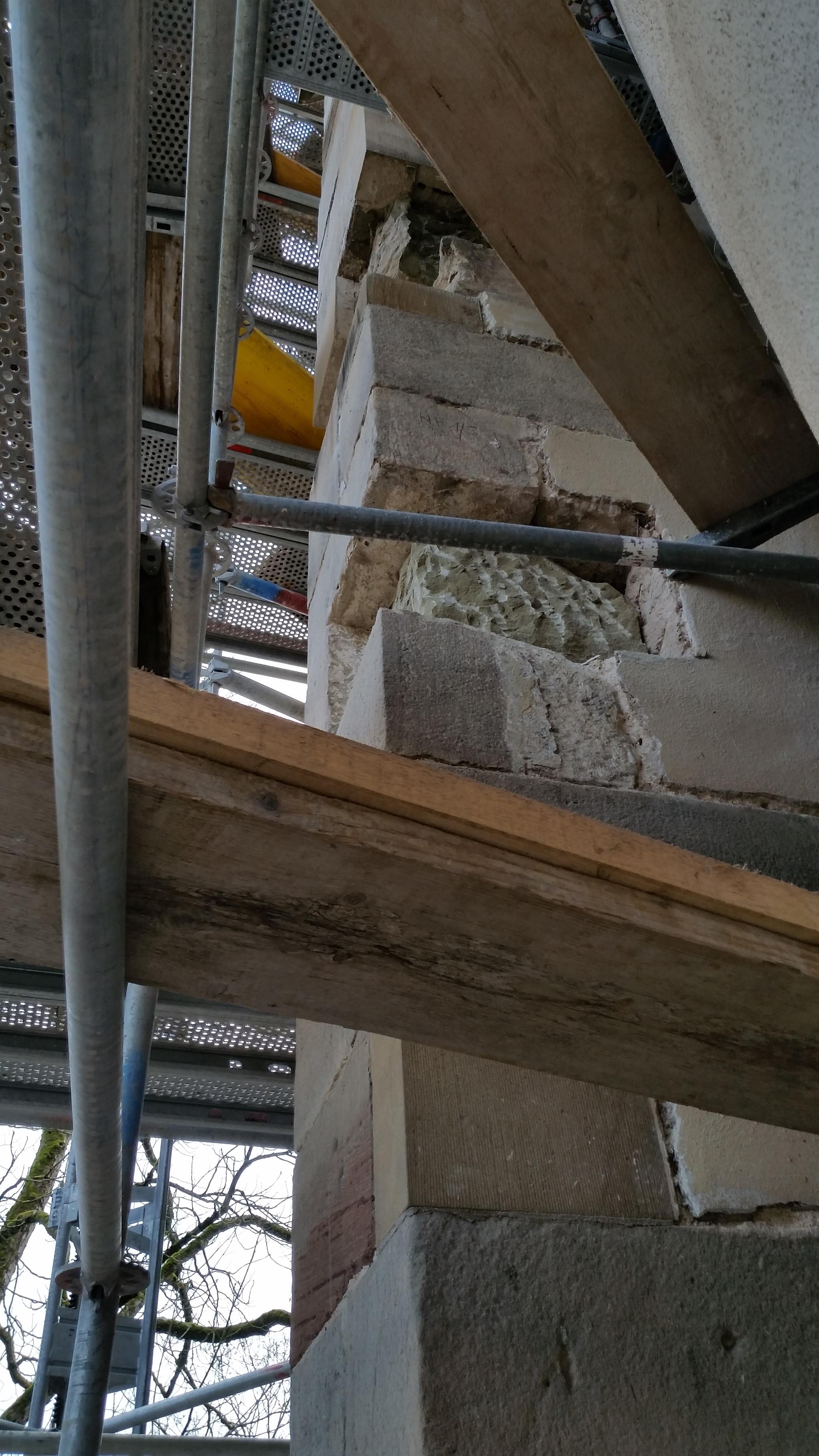 An der Außenfassade werden beschädigte Steine restauriert bzw. soweit notwendig ersetzt.